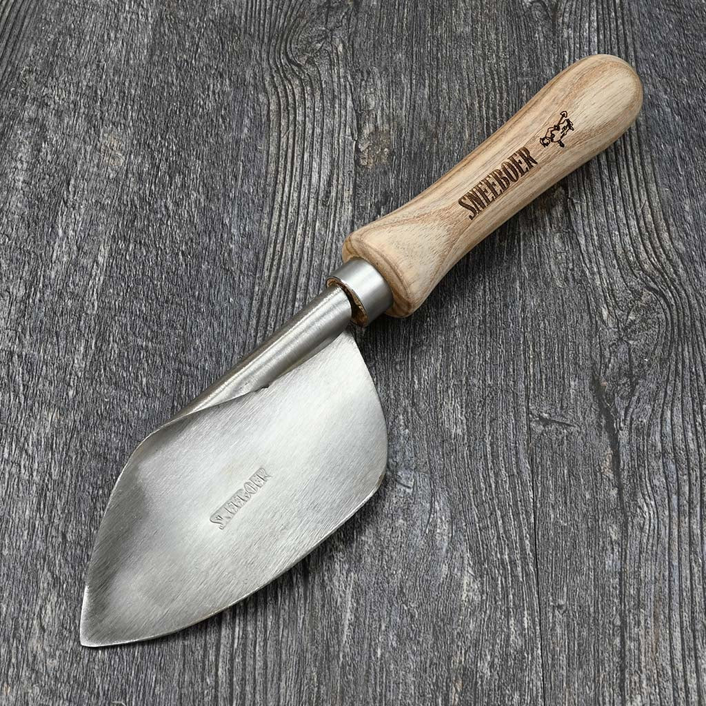 The Sneeboer Potting Trowel simplifies the messy task of filling pots and flower boxes with precision and ease. Its blade shape and handle placement allow for precise scooping and dumping without spilling. Its curved blade also makes it versatile for transplanting and removing root growth in porous pottery.